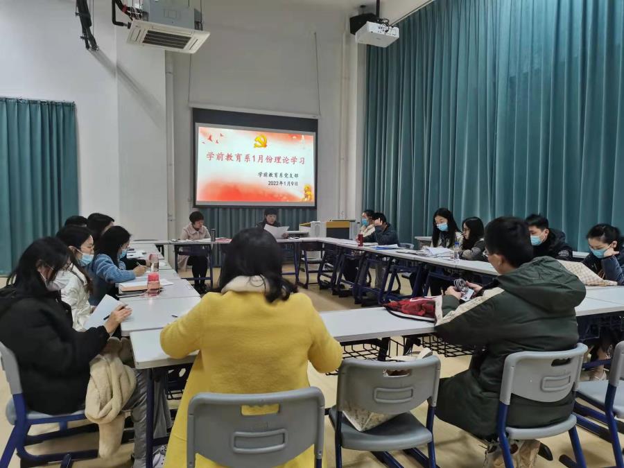 2022年1月9日晚7:00,学前教育系党支部在学前楼109教室开展1月份理论学习会暨主题党日活动 。会议由郭丽花书记主持,学前教育系党支部全体党员参加会议。