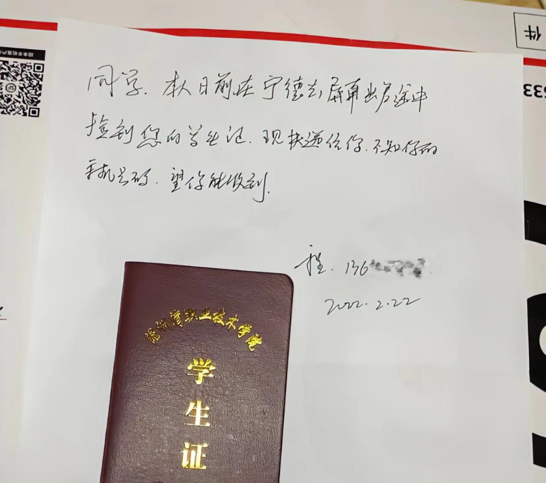 “喂,您好。请问是湄洲湾职业技术学院吗,我这边捡到贵校同学的学生证......”2023年2月24日早上我们接到了来自上海程先生的电话。