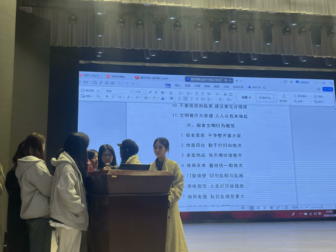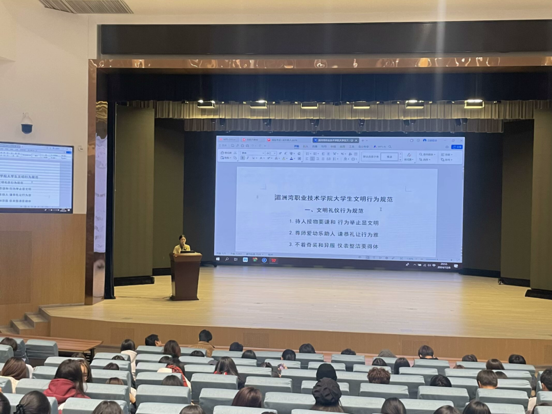 讲到校园文明,雷乙老师邀请了部分同学上台领读《湄洲湾职业技术学院大学生文明行为规范》,让同学们充分认识到校园文明建设的重要性,引导同学们自觉讲文明、讲礼貌、端品行、重修身,自觉遵守校园文明条例,时刻把文明行为深入于心、落实于行。