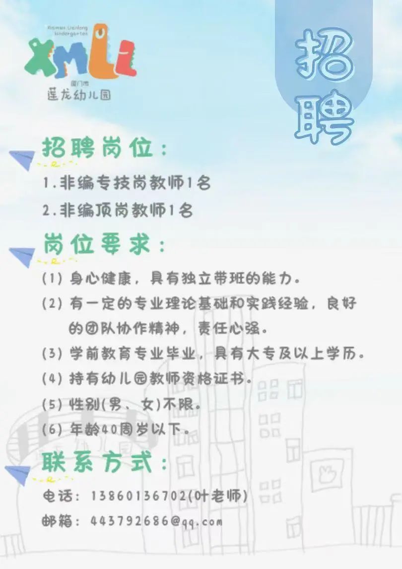 就业招聘||厦门市莲龙幼儿园招聘启事