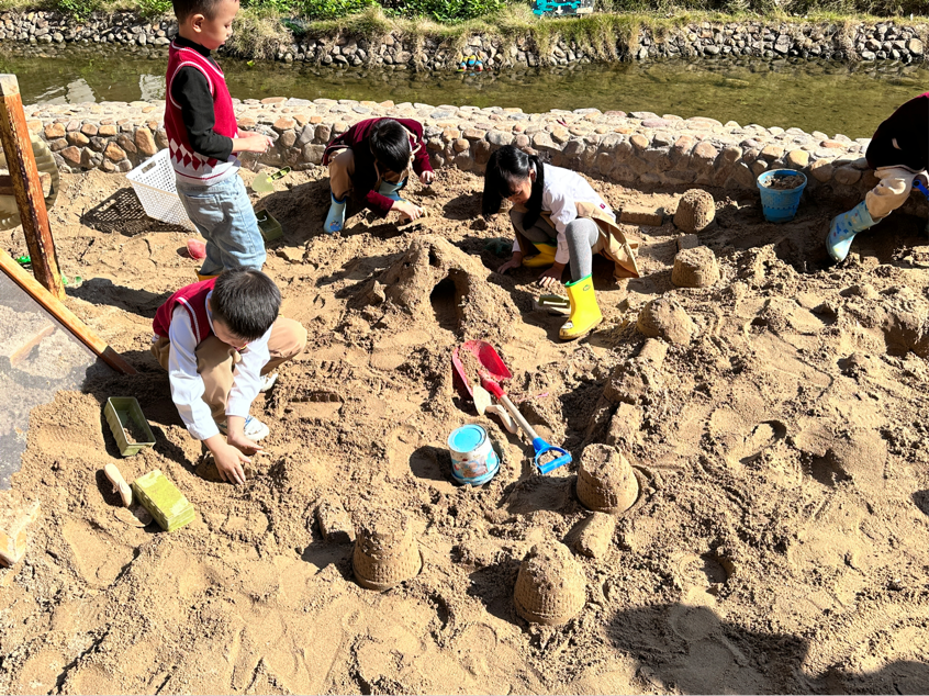 随后,同学们观摩了小、中、大三个年龄班的建构游戏。在大班,孩子们在陈钰婷老师的指导下,自主进行了一场名为《比奇堡》的建构游戏。他们巧妙利用沙池和各种模具,创造出了一个充满想象力的海底世界。孩子们分工明确,合作无间,展现出了令人瞩目的创造力和搭建技巧。